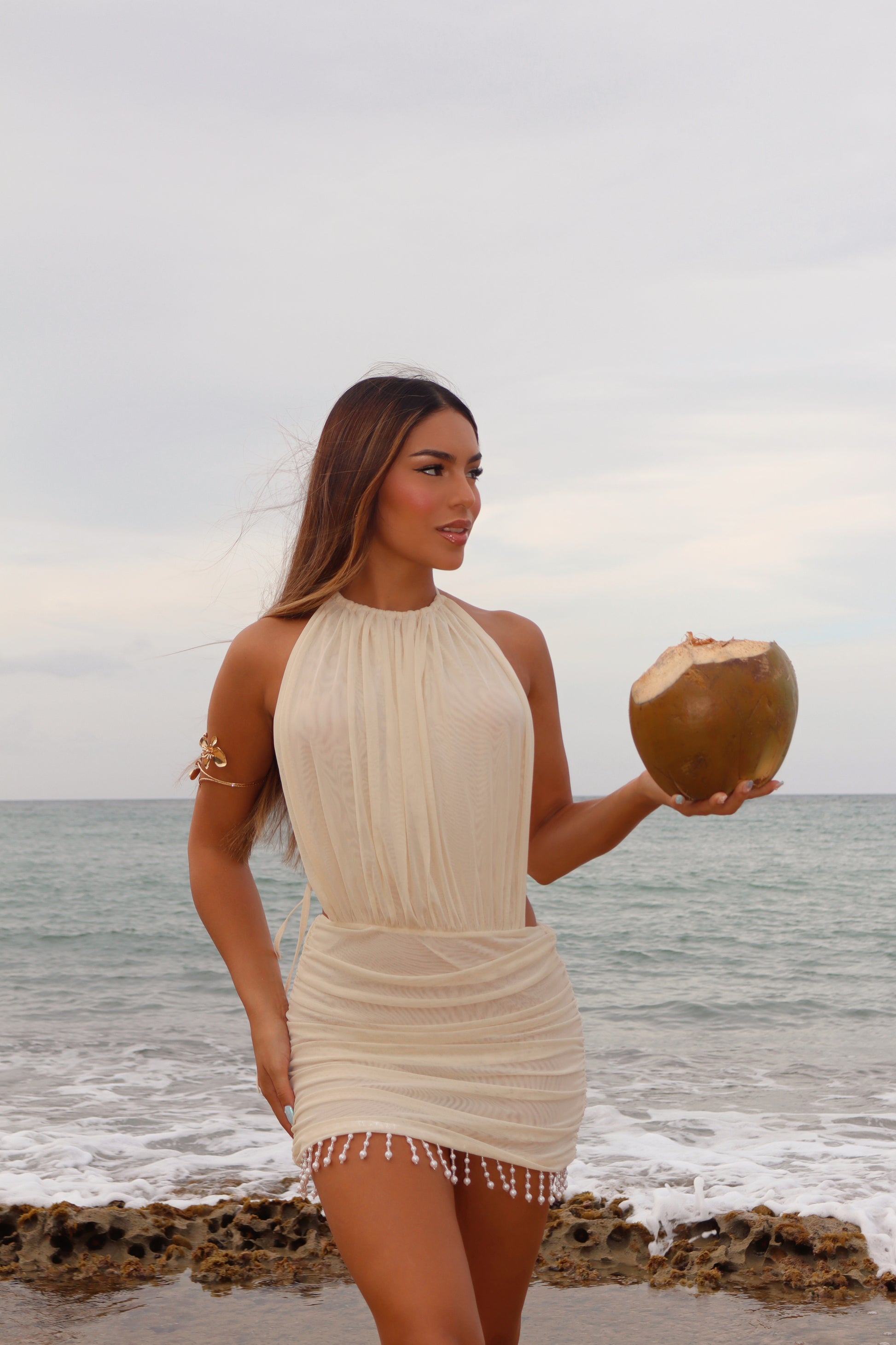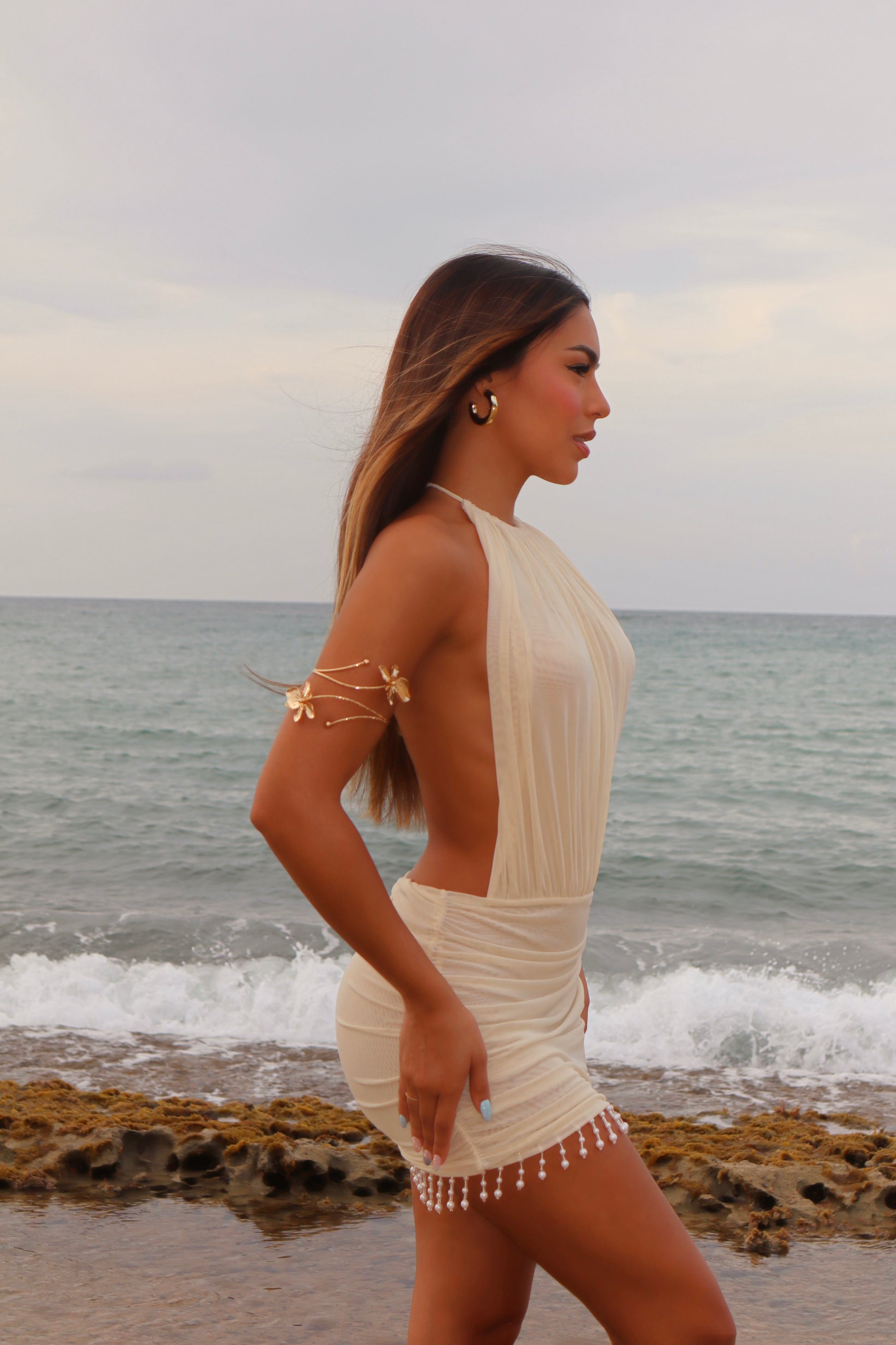 Island elegance with a pearly touch. This ivory halter dress carries a light fabric that allows movement and flow adding a beautiful touch with an opened back.